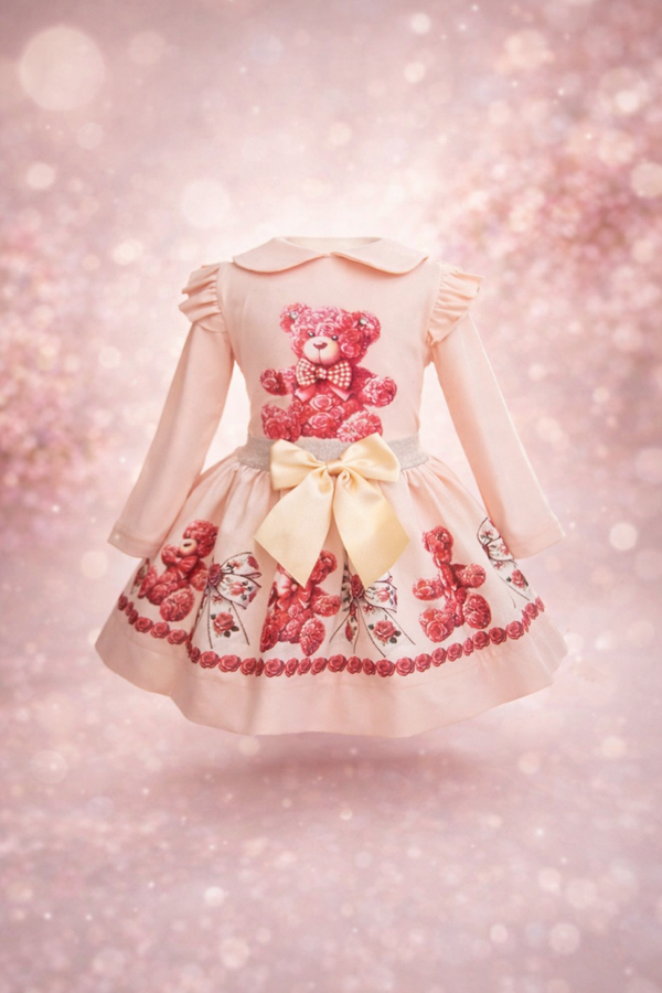 Schattig meisjesjurkje in zachte perzikkleur met een lieve teddybeerprint, elegante kraag en sierlijke strik in de taille. Perfect voor feestjes en speciale momenten – comfortabel, stijlvol en onweerstaanbaar lief.
