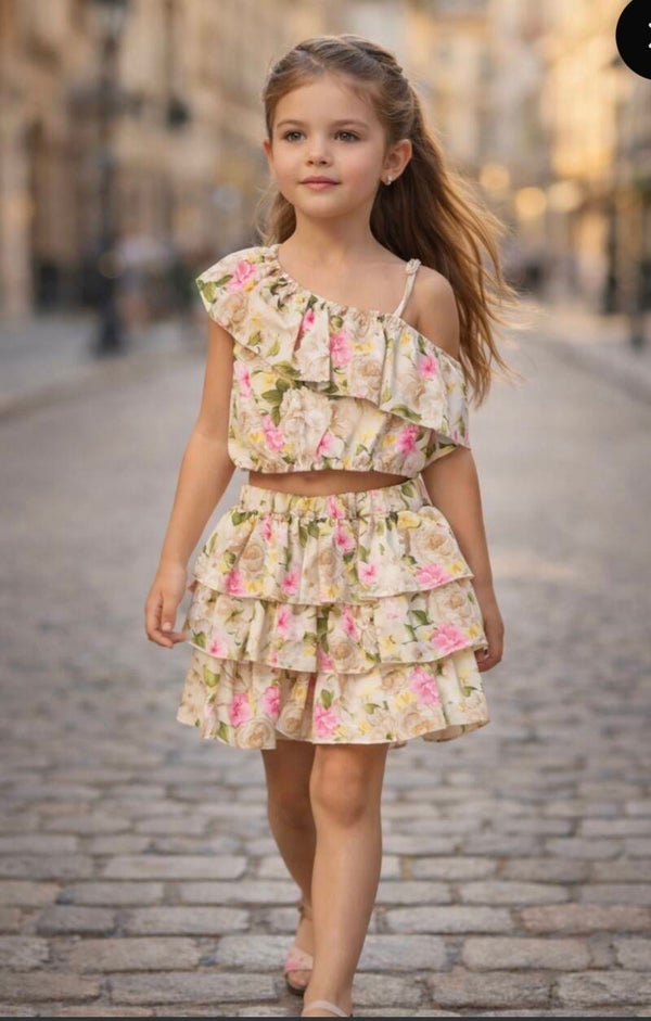 Dit charmante setje combineert een speelse uitstraling met een romantisch bloemendessin. De set bestaat uit: