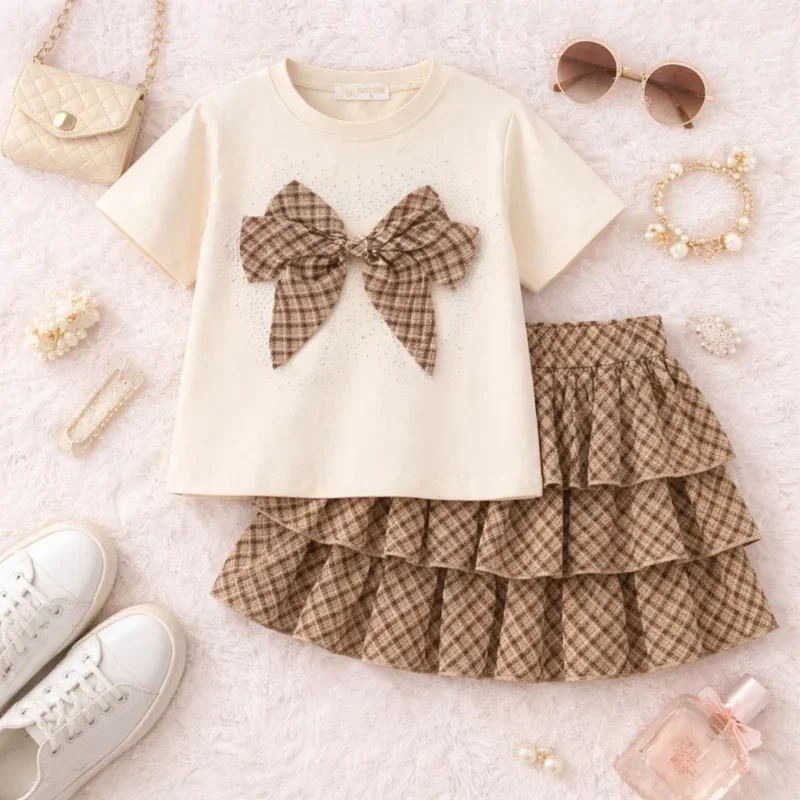 Schattige en stijlvolle 2-delige meisjes set met een zachte top en een speels rokje met ruffles. De mooie strik op het shirt en de warme beige tinten zorgen voor een trendy en lieve uitstraling. Perfect voor dagelijks gebruik, feestjes of een zomerse dag!