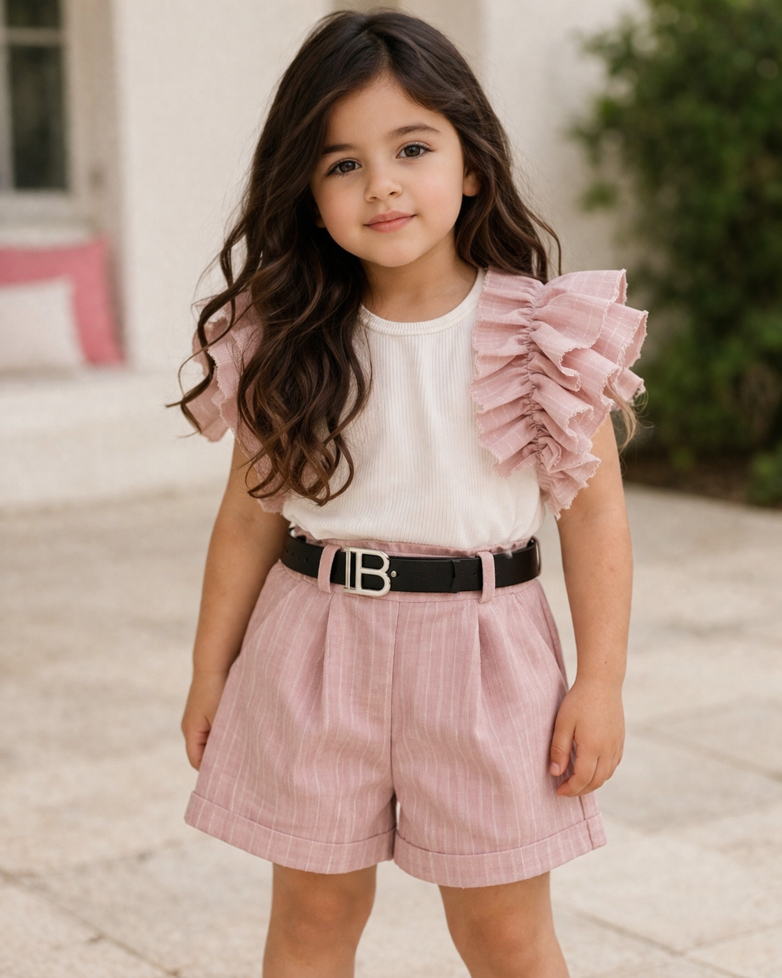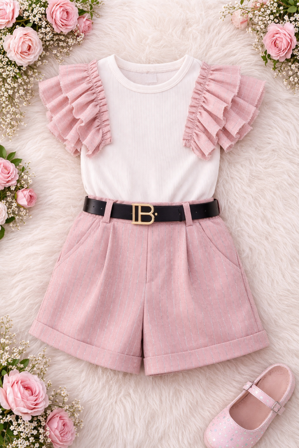 Een elegante en speelse outfit met een witte ribtop en zachte roze ruches, gecombineerd met een stijlvolle high-waisted short met subtiele zilveren glitterstreepjes. De set wordt afgewerkt met een trendy riem en straalt een perfecte mix van comfort en luxe uit – ideaal voor zomerse dagen en speciale gelegenheden.
