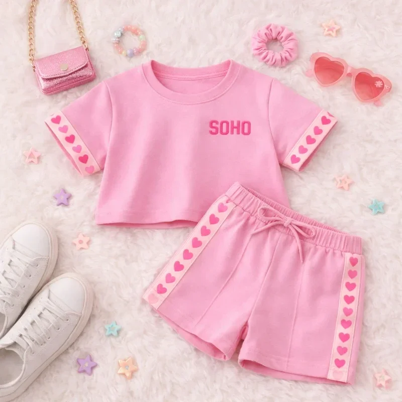 Stijlvolle en comfortabele tweedelige set voor meisjes, bestaande uit een cropped T-shirt en bijpassende short met hartjesdetails. Gemaakt van zachte, ademende stof en perfect voor casual dagen of zomerse outfits. Verkrijgbaar in 2 trendy kleuren.